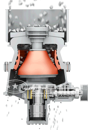 單缸圓錐破碎機工作時:電機帶動破碎機的小齒輪,小齒輪帶動大齒輪,大齒輪組件(大齒輪、大齒輪架、偏心鋼套)帶動偏心套組件(偏心缸套、偏心銅套)和主軸組件(主軸、內(nèi)錐、內(nèi)錐襯板)以理論垂直線為中心,在銅襯套內(nèi)公轉(zhuǎn),主軸組件在偏心銅套內(nèi)以主軸的中心線可以實現(xiàn)自轉(zhuǎn)??諜C運行的時候,偏心套組件“抱著”主軸組件和隨大齒輪一同公轉(zhuǎn),當物料加入到破碎腔后,主軸總成(主軸、內(nèi)錐)在物料的阻力下在偏心銅套內(nèi)緩慢的自轉(zhuǎn)。內(nèi)錐的運行軌跡看起來是在破碎腔內(nèi)來回擺動,同時緩慢的旋轉(zhuǎn)。物料被擺動的內(nèi)錐擠壓破碎。支撐套與架體連接處靠液壓缸壓緊,當破碎機內(nèi)落入金屬塊等不可破碎物體時,單缸的動錐由底部液壓活塞托起,起到排放口調(diào)整和過鐵保護、反復起落排除堵礦的作用。